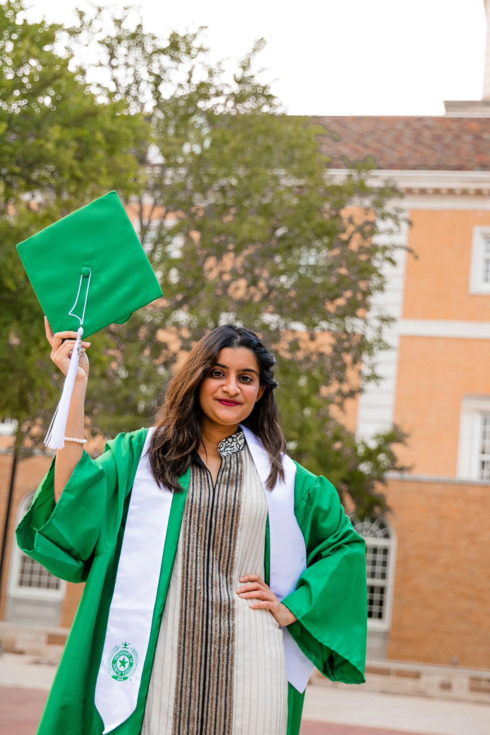 A woman in a green graduation gown and white stole standing outdoors in front of a brick building and trees, holding up a green graduation cap.