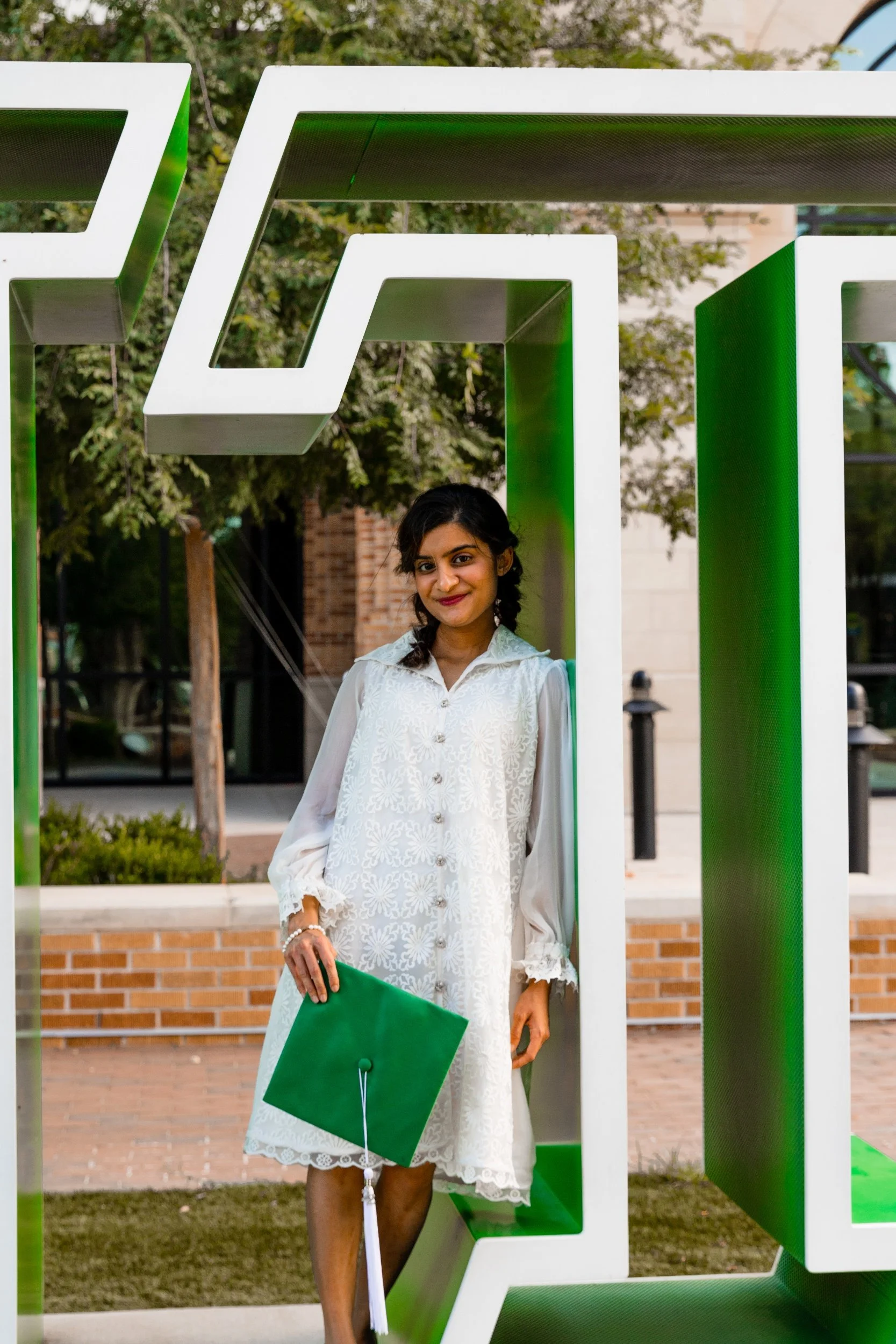 A woman in a white dress and black heels stands next to a large green and white sculpture at a university campus, celebrating graduation with a green cap hanging on a part of the sculpture and a green gown draped over her arm.